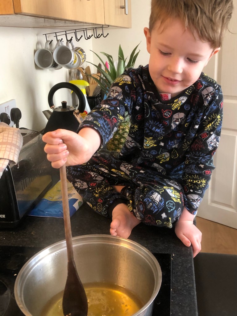 After we had made it (it took around 14 hours as you start it in the evening and then leave it to infuse overnight. But there’s nothing overly tricky. Toby had some honey on bread for his lunch and enjoyed every bite.