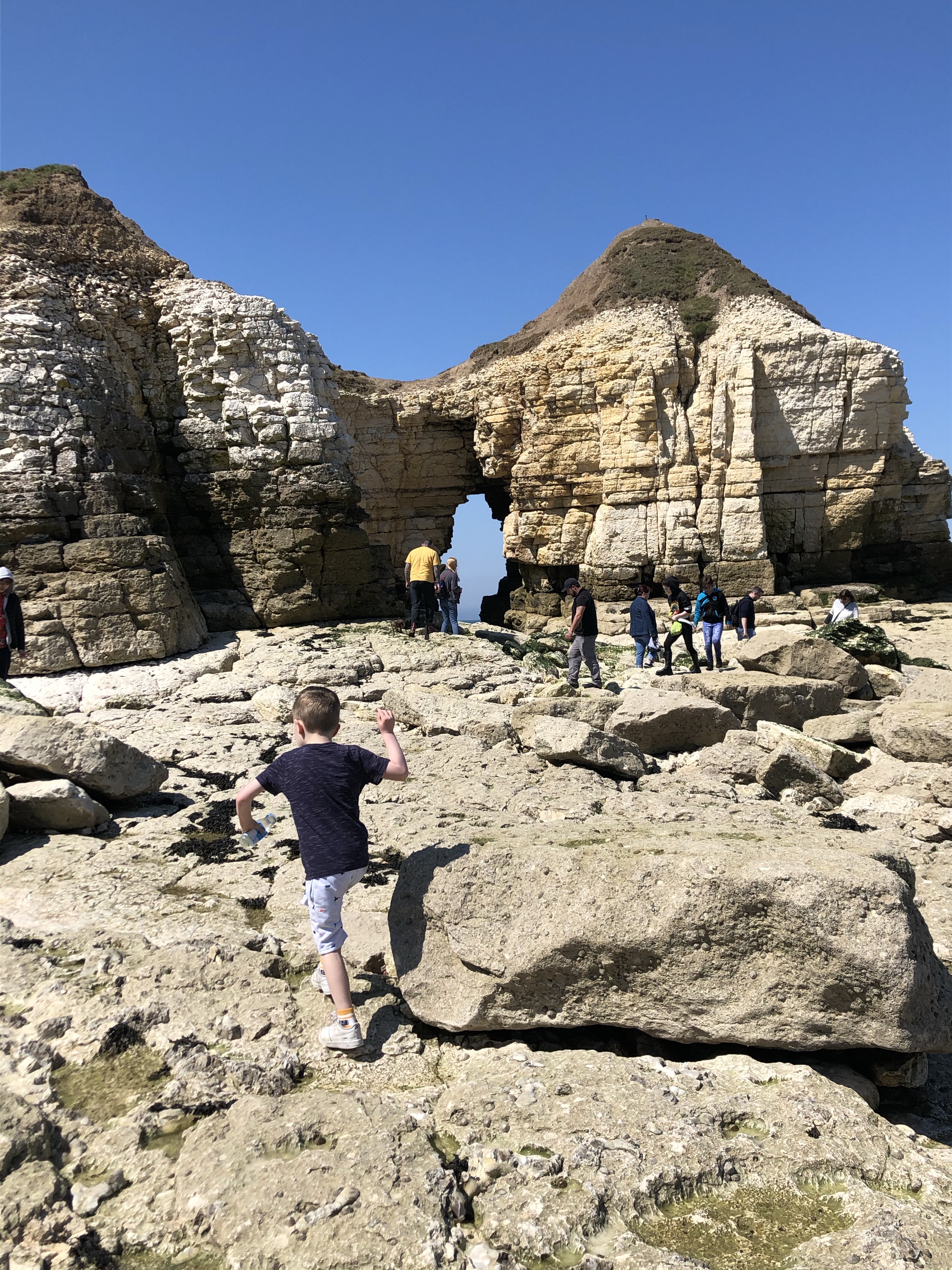 We started by exploring a beautiful natural arch to the right before venturing under another arch at the other side of the beach round into a whole new beach. It’s a good work out scrambling across the uneven rocks and climbing the rocky steps that take you along the beach. If you do get caught out here by the tide, or just don’t want to walk back there is a precarious staircase that we ascended to take us back to the Thornwick Bay cafe. This path could be dangerous in anything other than dry conditions I think as it appears there’s been some shift in the steps and some are missing, but it was dry yesterday and we managed it easily enough with a 5 year old in tow.