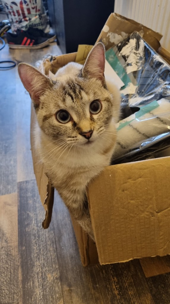 This is Loki, the little kitten we found last year living under a container. She’ll be around 8 or 9 months now. Today we took down our Christmas tree and I put our glass ornaments in this box. Loki decided it would be a comfortable place to sleep, far more comfortable than her padded cozy bed next to the box.