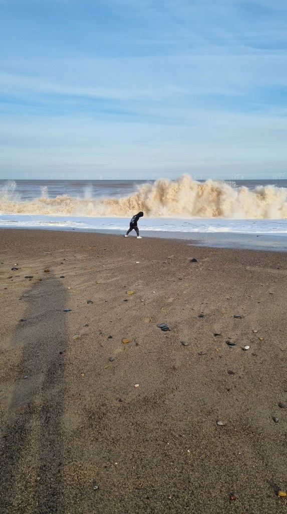 We spent a while today on the beach, the North Sea was wild and Toby had great fun being chased by the waves.